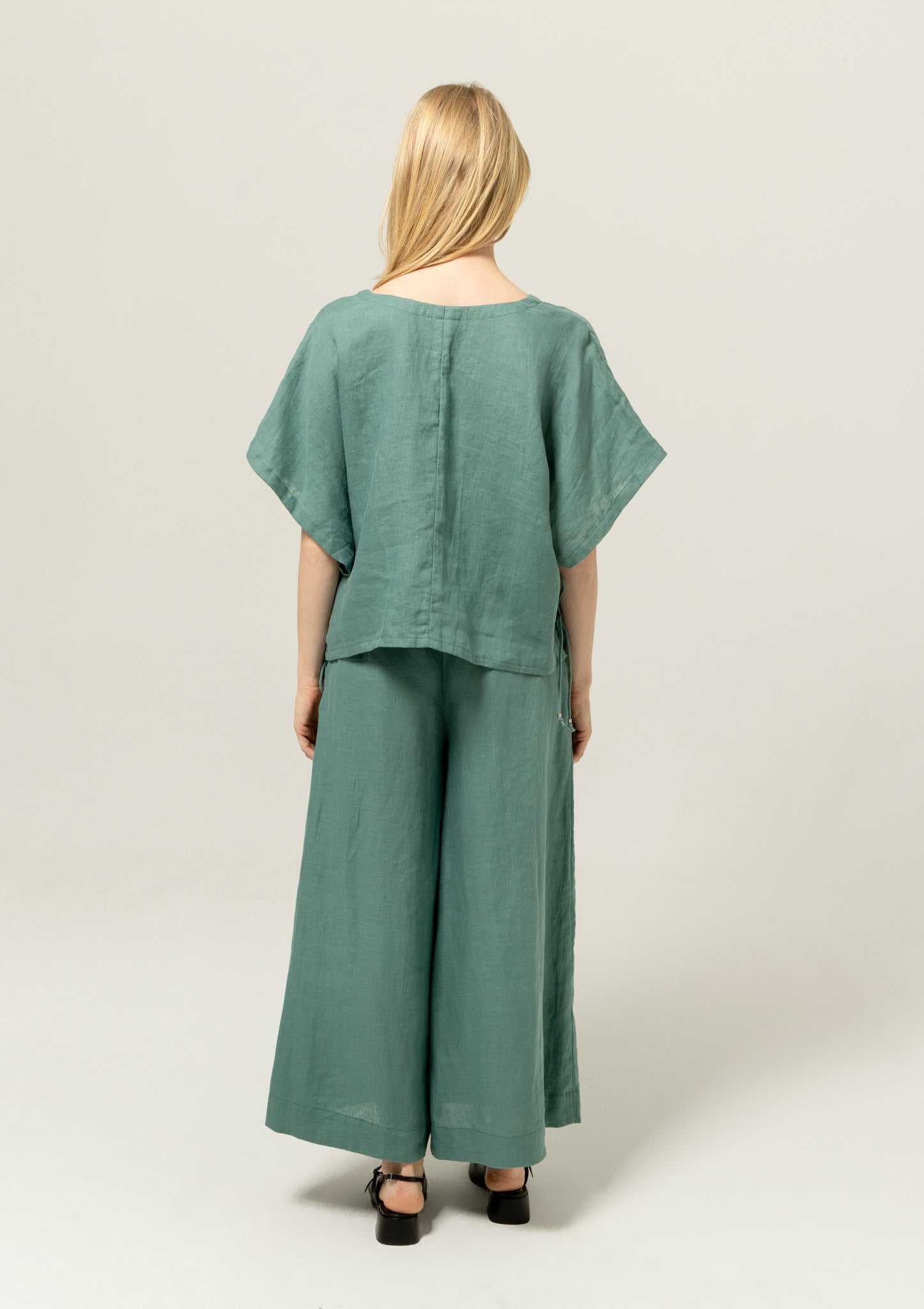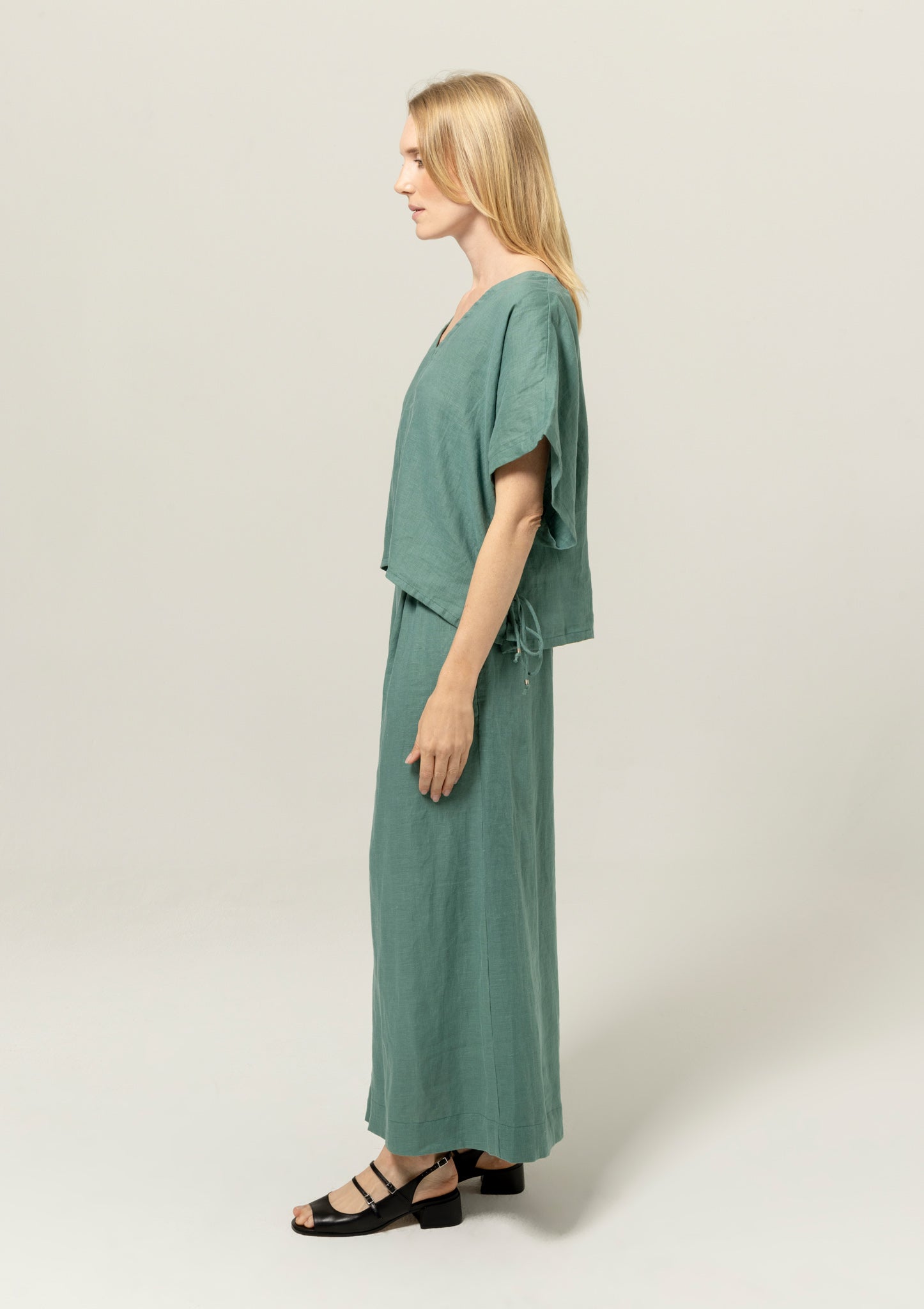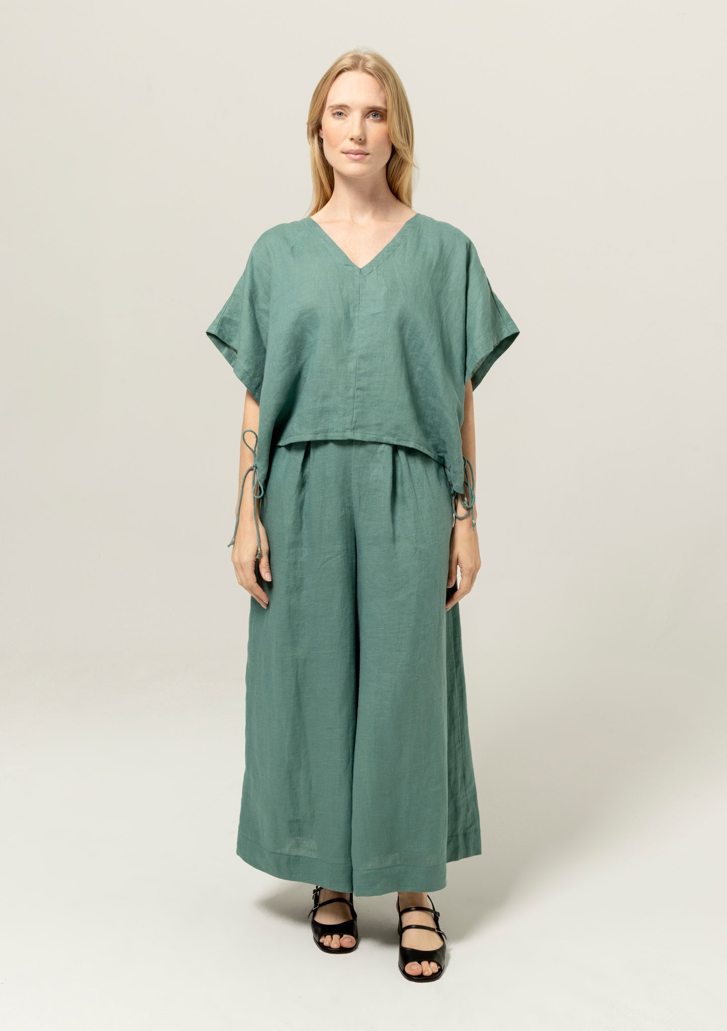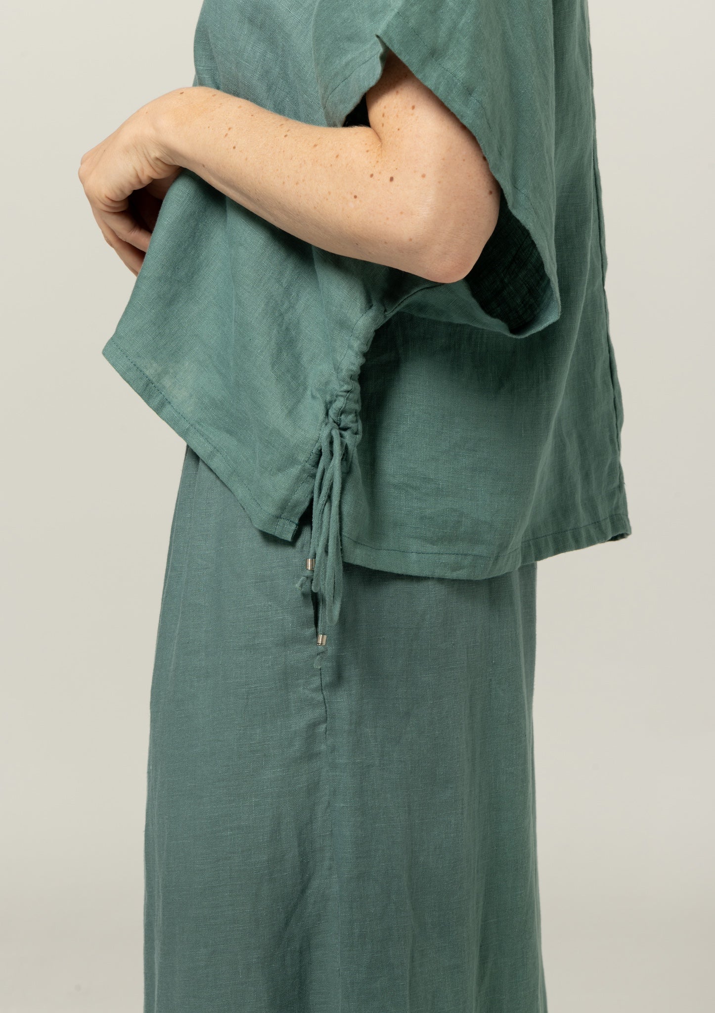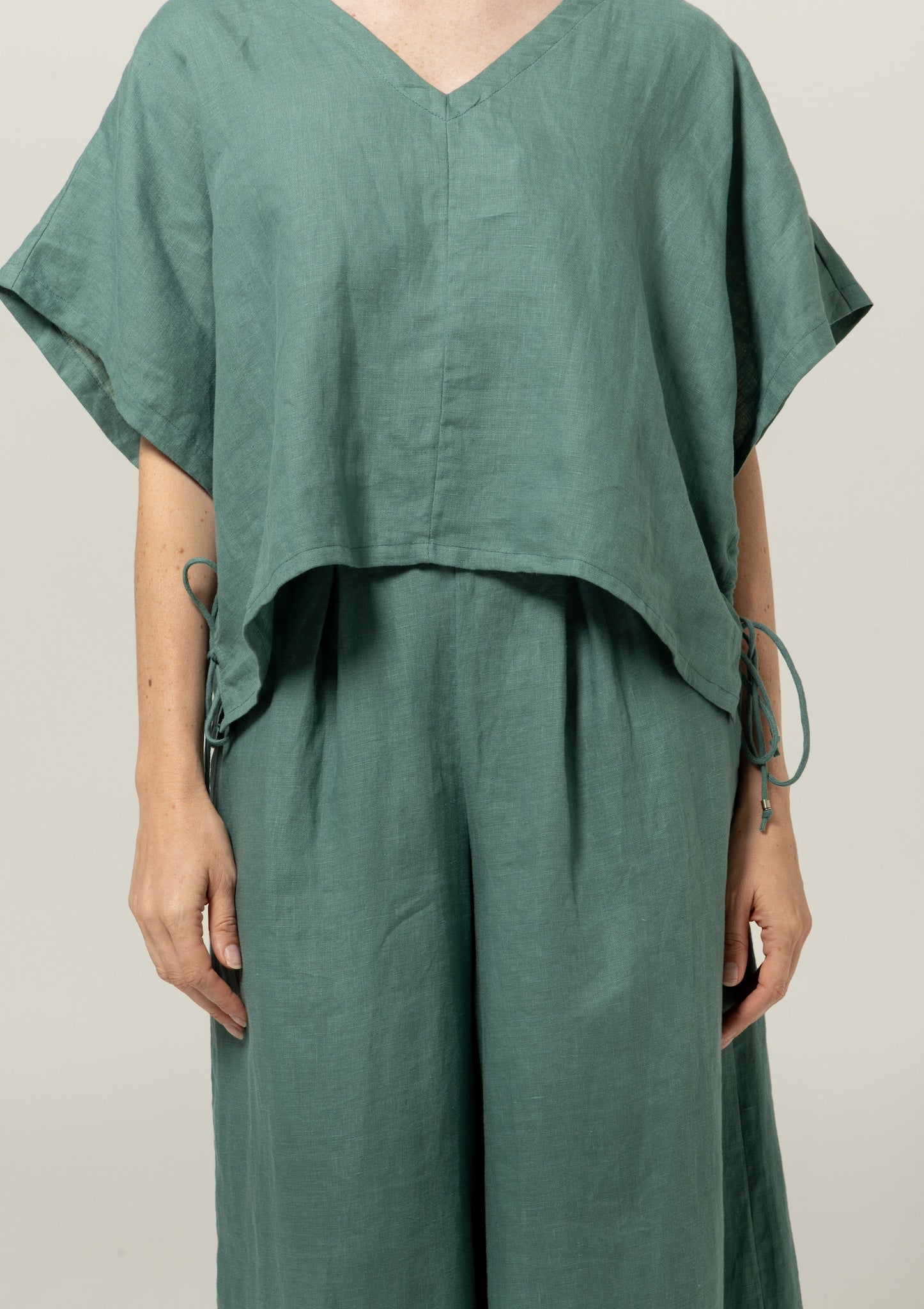 The Isla Top is a loose, short-sleeve style made from breathable linen. Its delicate V-neck, and subtle ties at the waist for a flattering fit make it perfect for warm days. Offering effortless comfort and a cool, laid-back vibe, ideal for casual outings or easy summer moments. Pairs perfect with the Atlas Pant.
