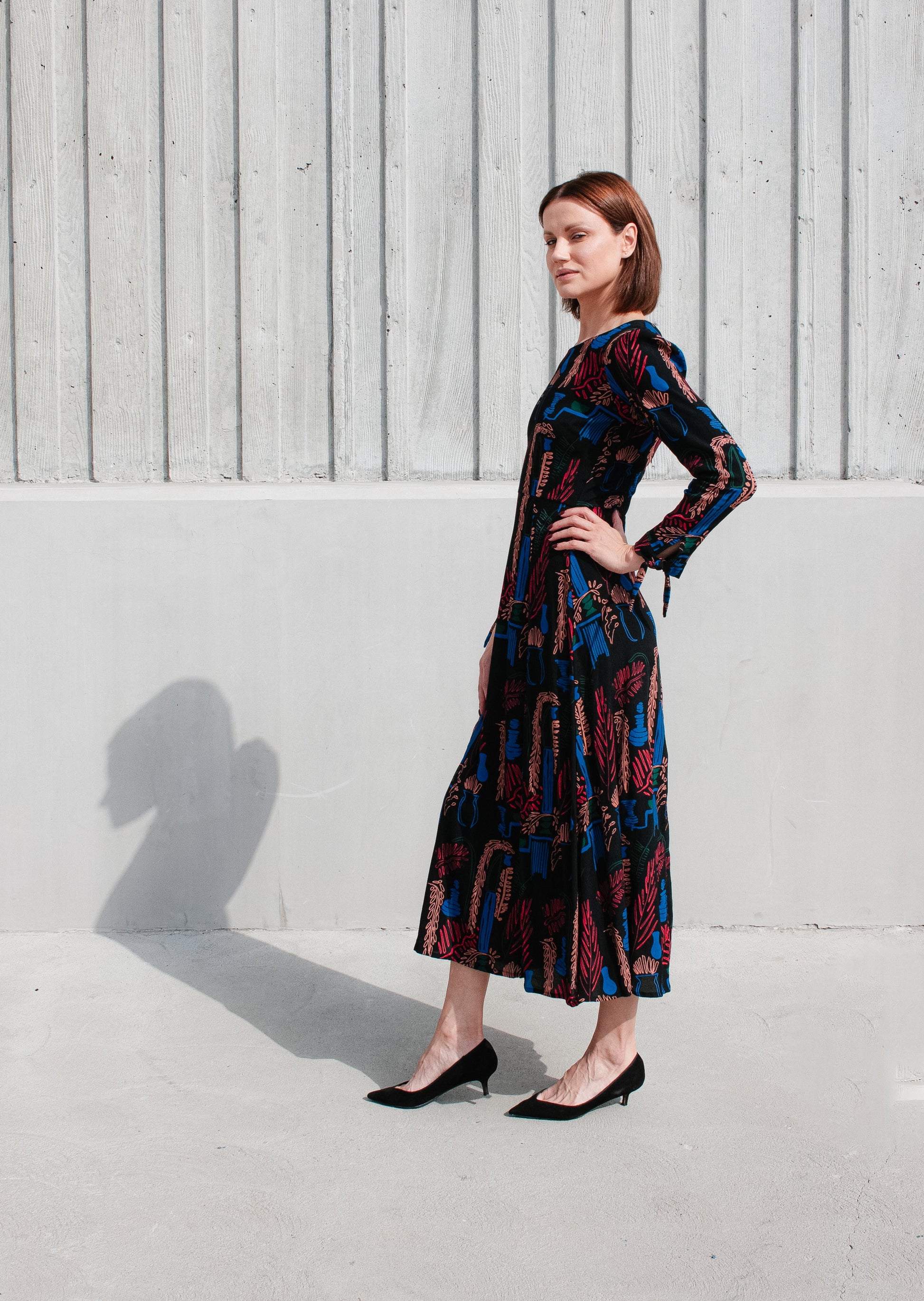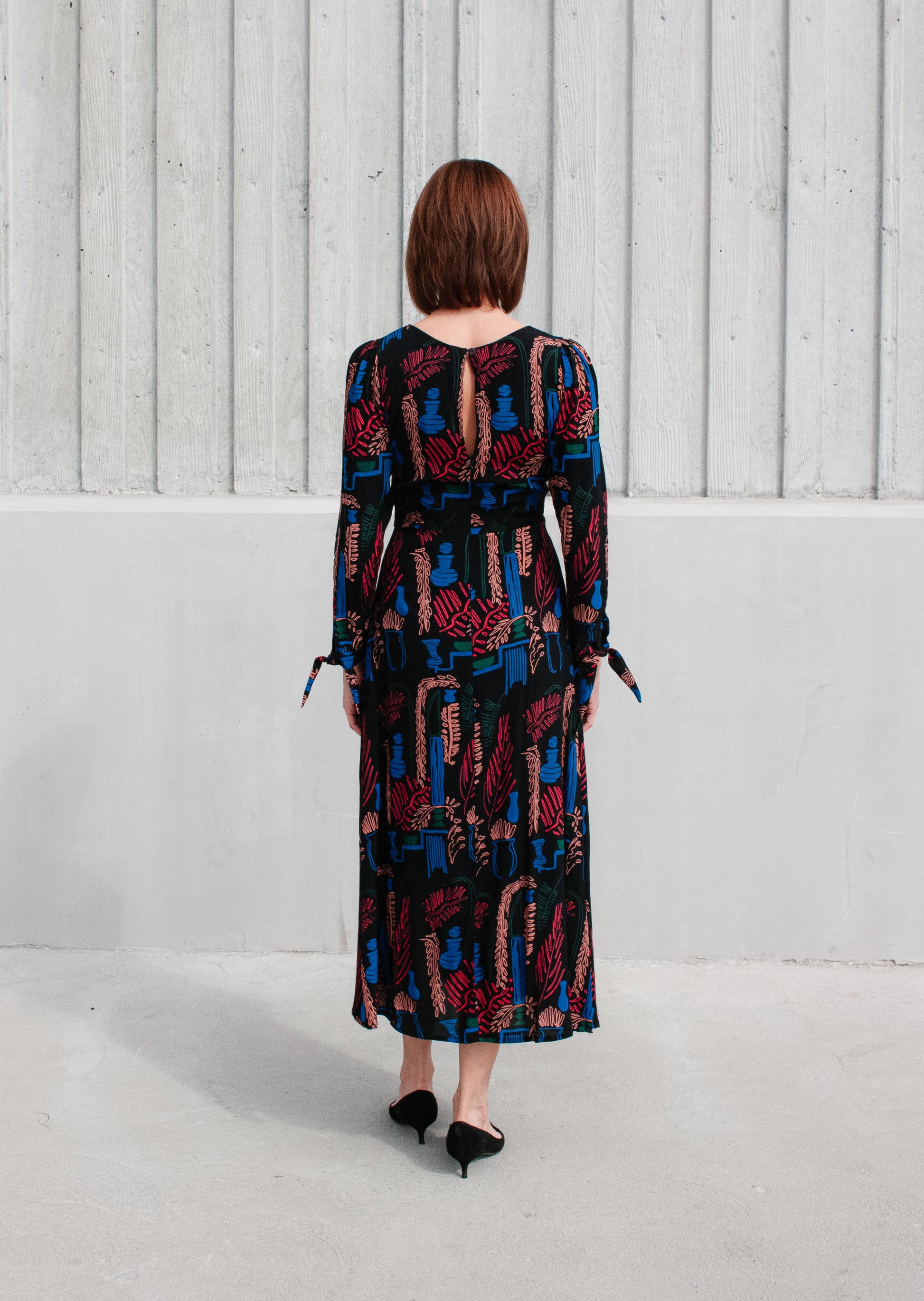 Timeless and unforgettable with a stunning single slit. The best selling Kate Dress features a calf grazing a line skirt and sweet ties at the wrists.