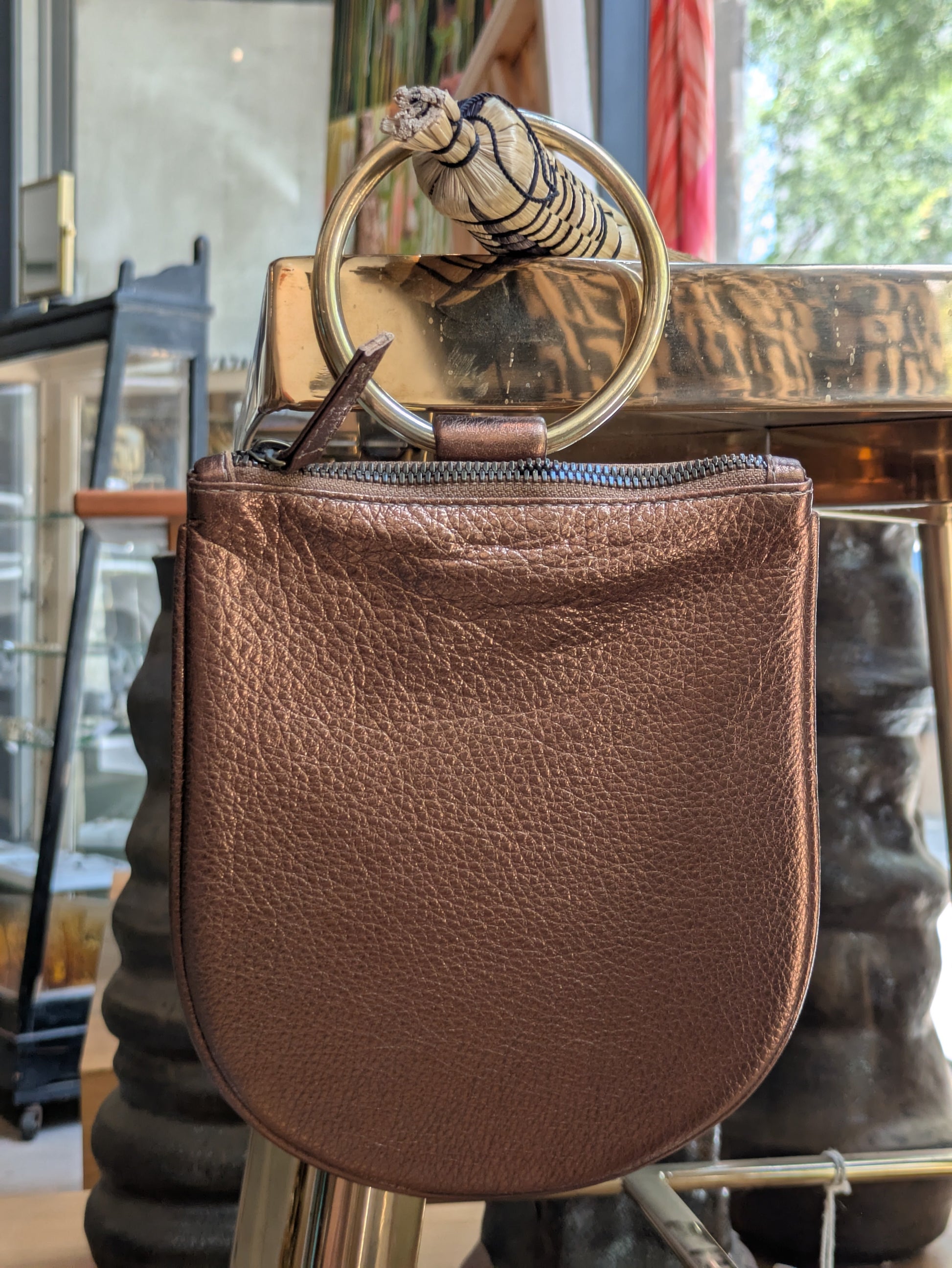 Your new go to bag. Just the right size for your essentials, with a unique shape and metal ring. Crafted from gorgeous pebble textured leather.