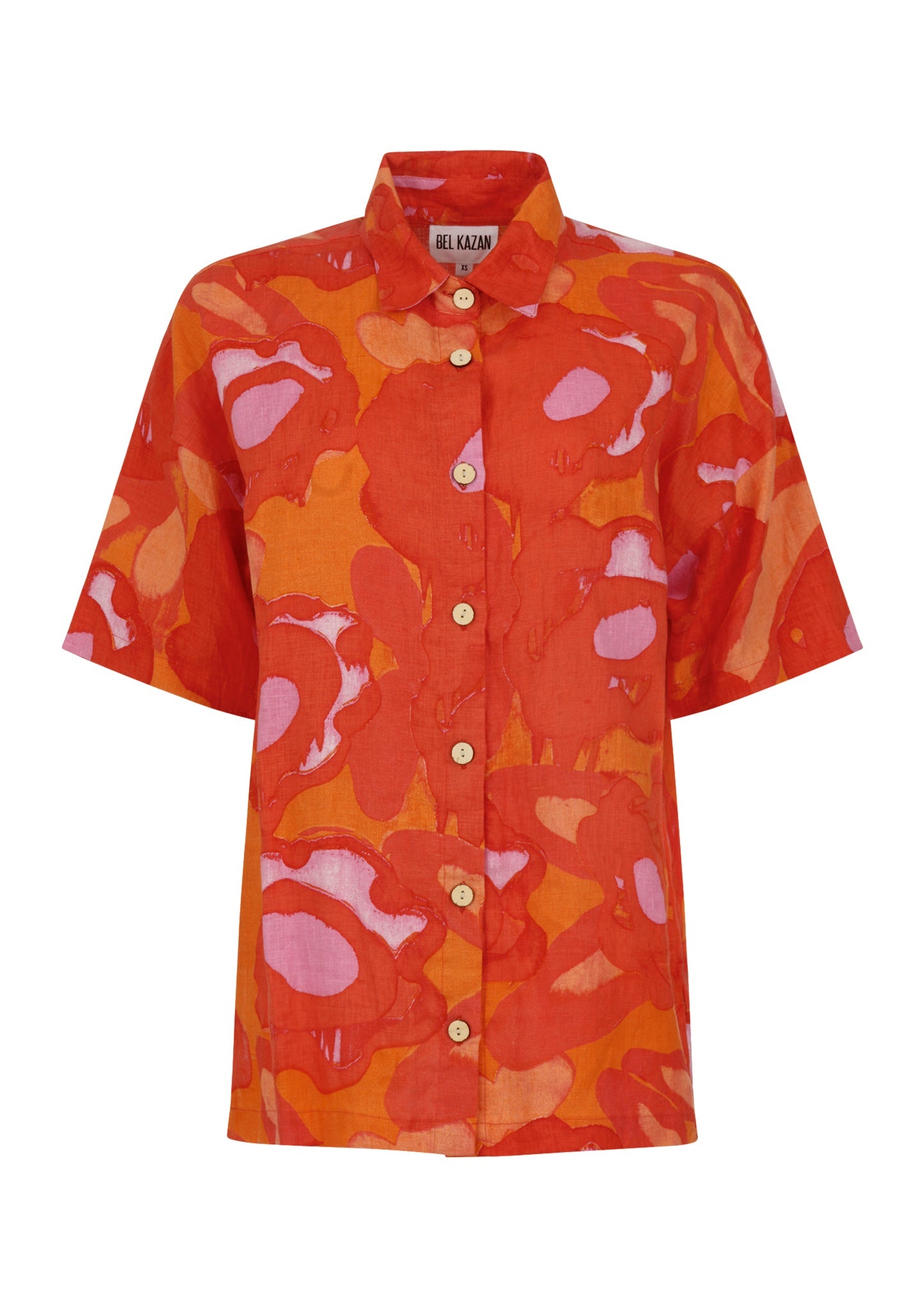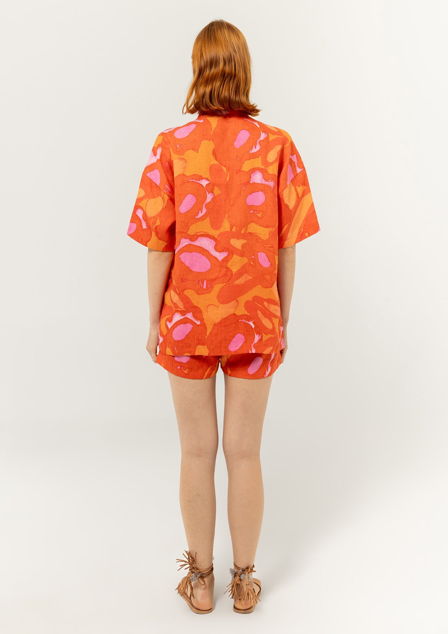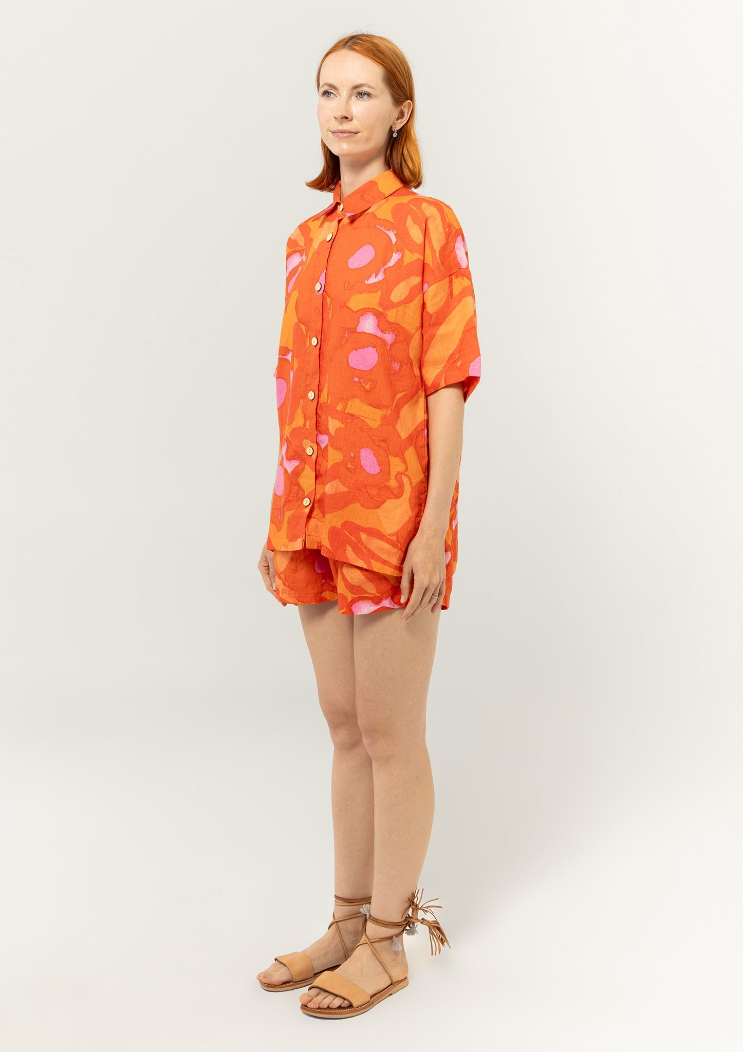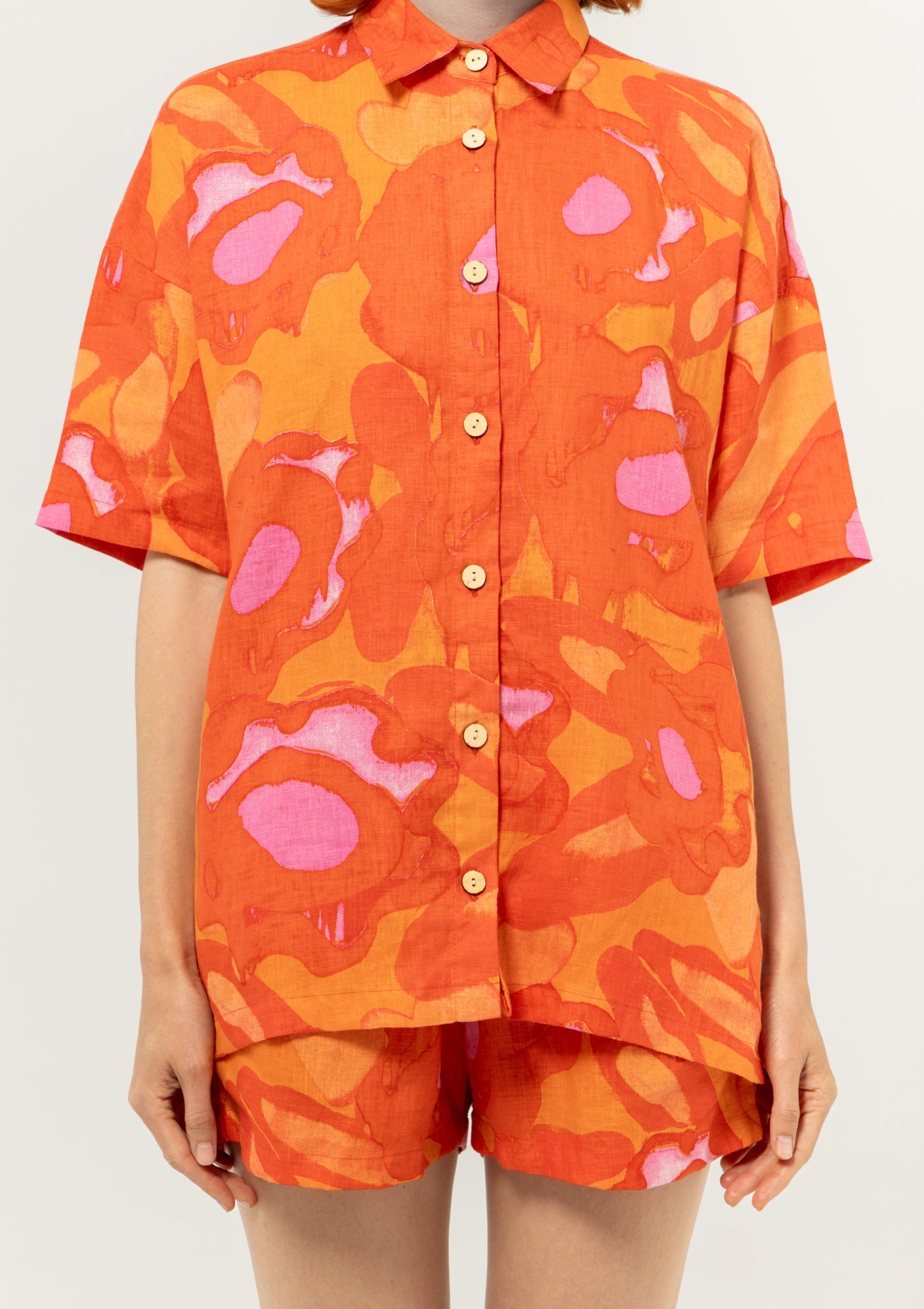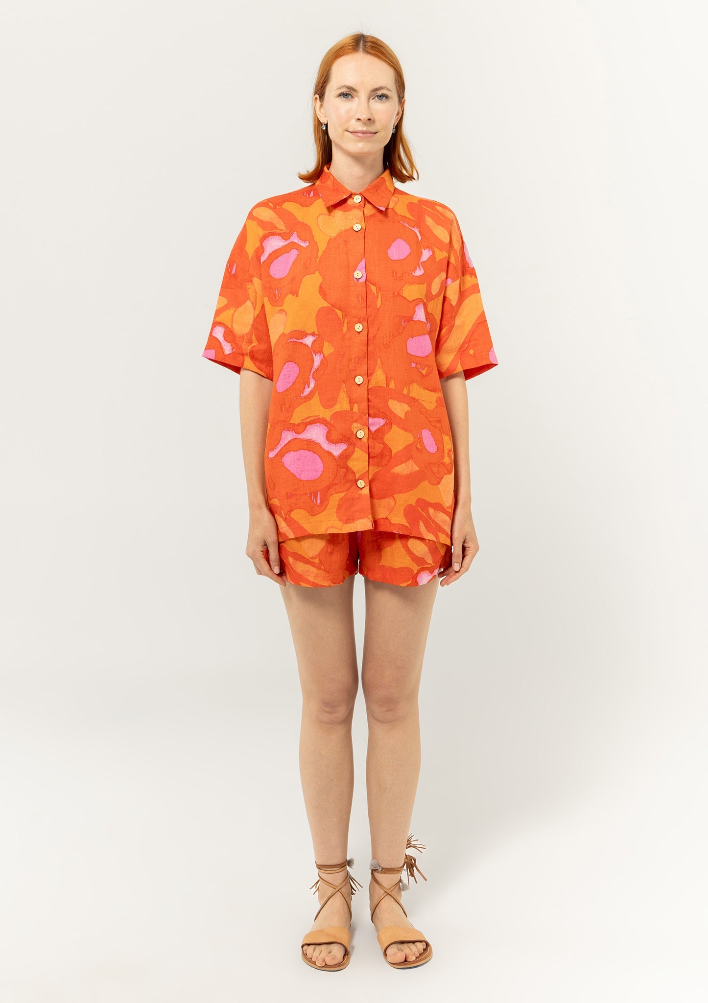 Organic cotton meets vibrant handprinted colorways in this lightweight button-up top with delicate ruching. Lounge at home or take it for a stroll, plus pair it perfectly with our Mia Shorts.